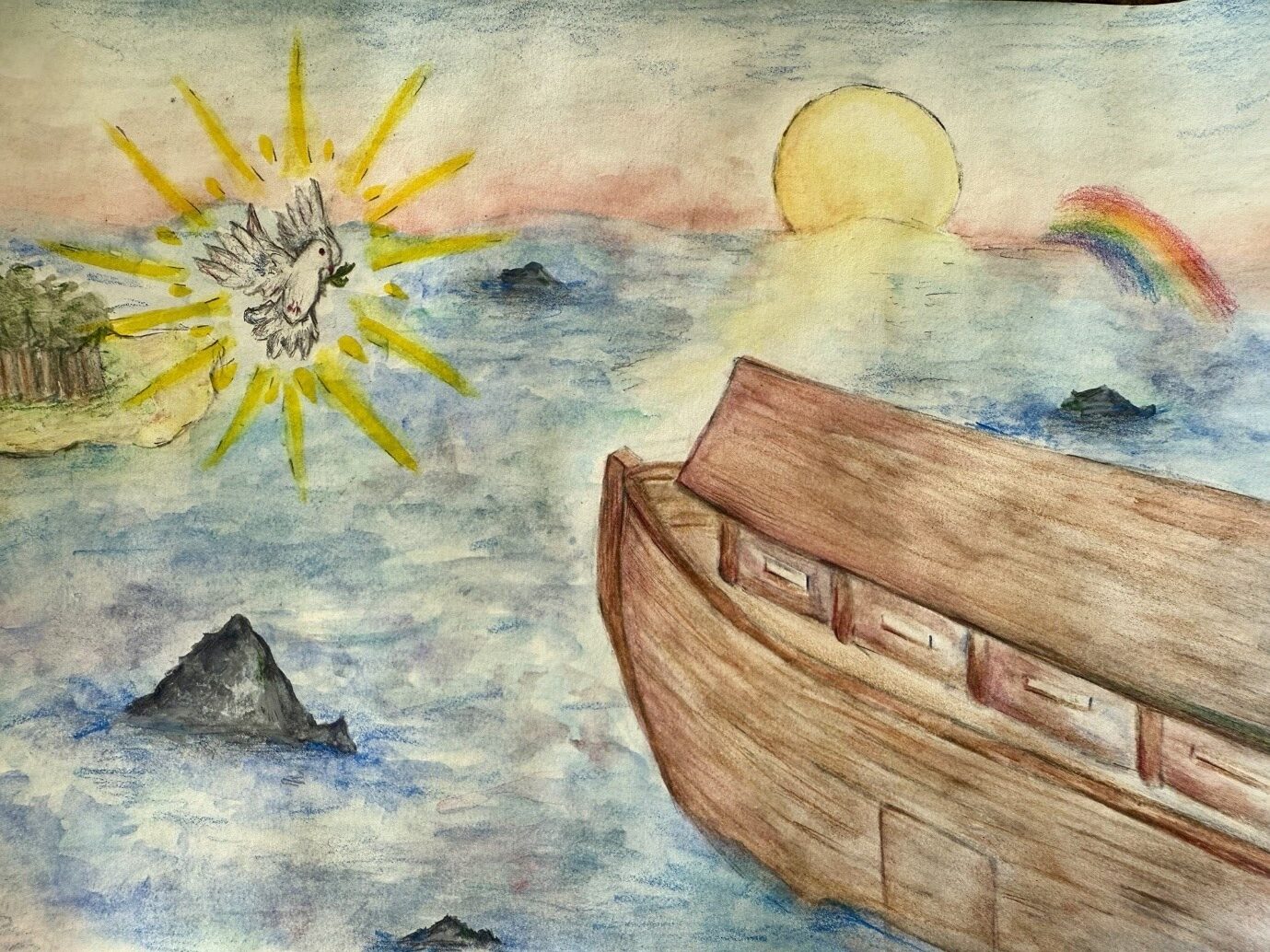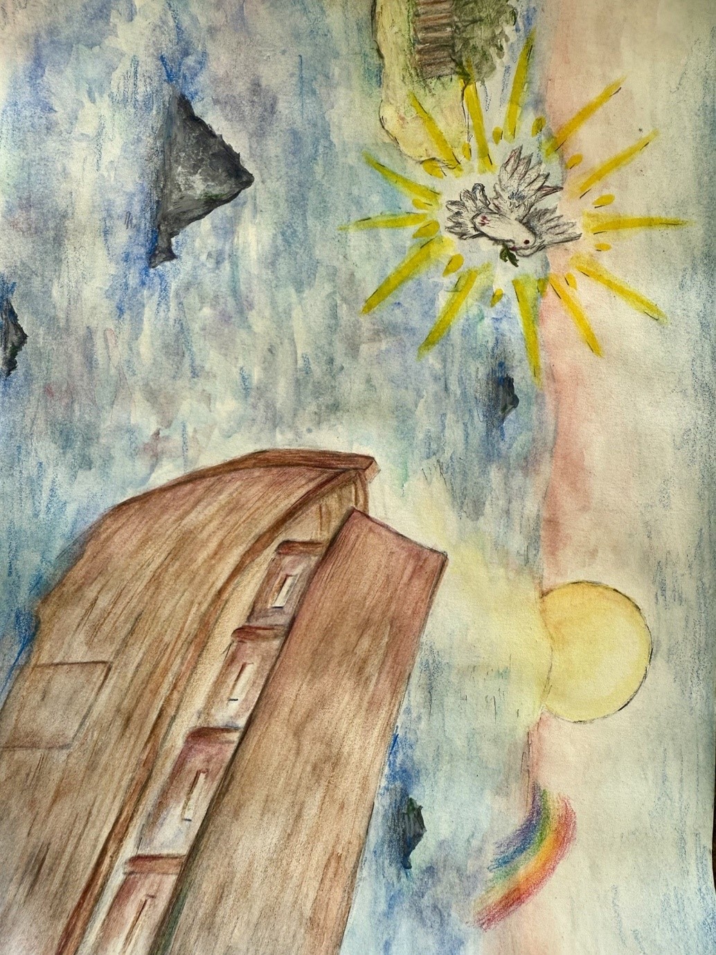 “To represent the Jubilee year theme of ‘hope’, I chose to paint the story of Noah and the Ark in watercolour. I thought of this Bible story first because, to me, it shows hope despite uncertainty and despair. Even after waiting and almost losing hope, the dove appears with an olive branch to Noah and his family to show that they are almost out of the flood, and that there are always brighter days ahead.” – Elouise Lockley, Student