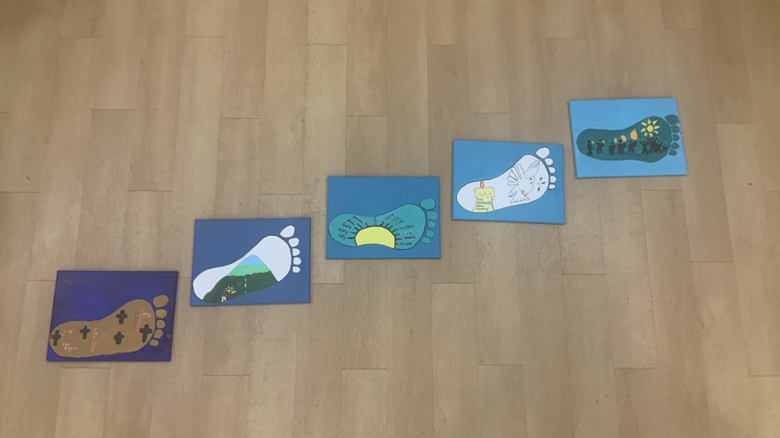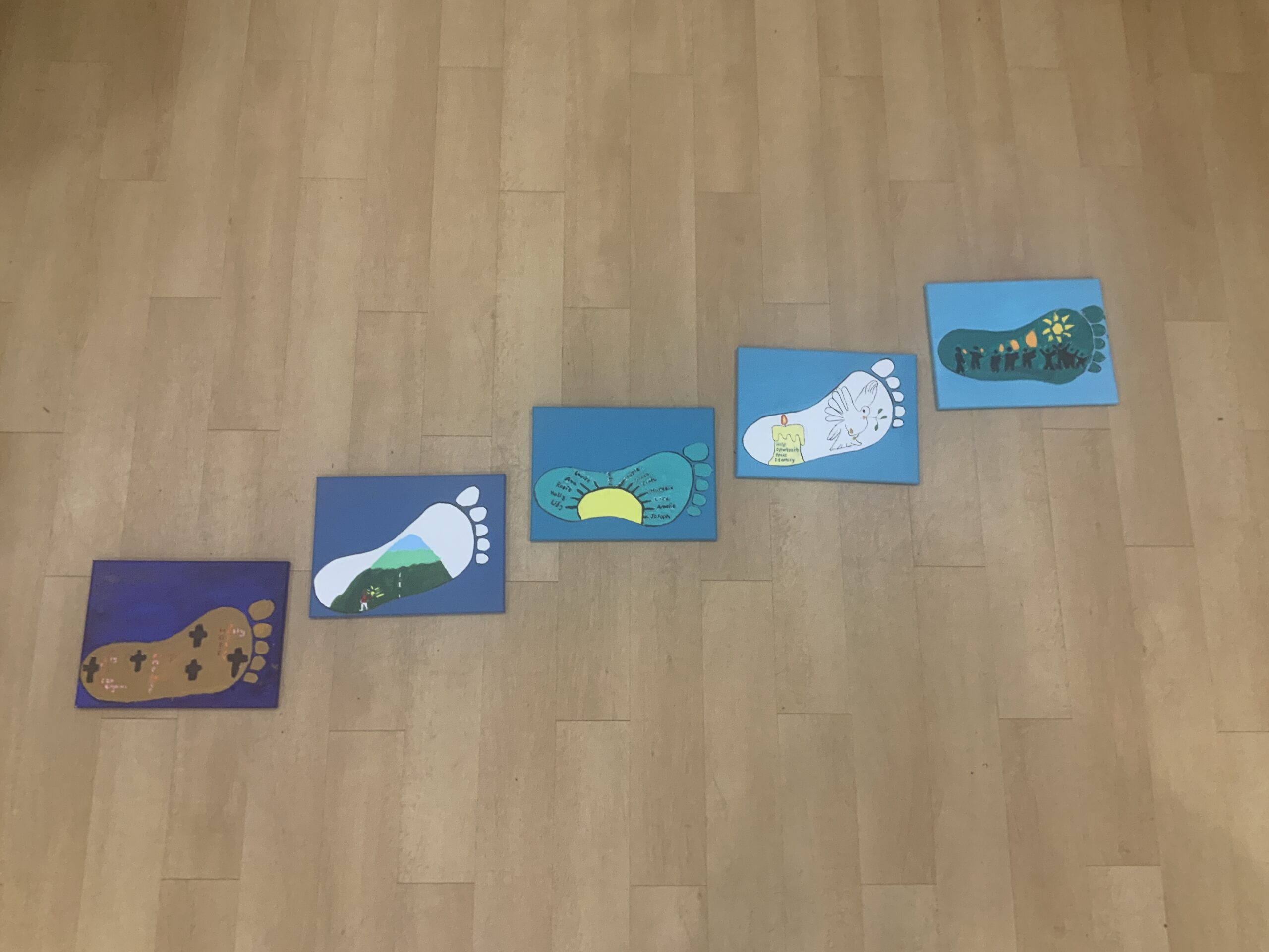 “The group chose Pilgrims of Hope as their theme, with each footprint symbolising a step in the faith journey ahead—each step itself an act of hope. Members first sketched individual ideas, then collaborated in small groups to assemble and paint them onto the footprints. Many similar concepts emerged, especially those connecting the names of the group members, powerfully expressing their shared faith, inclusivity, and the strength of unity. The staggered path of footprints, along with the mountain and sun imagery, reflects the non-linear yet ultimately uplifting journey of hope in faith.” – Margaret Simon, Youth Leader at the Parishes of Rickmansworth, Mill End and Chorleywood.